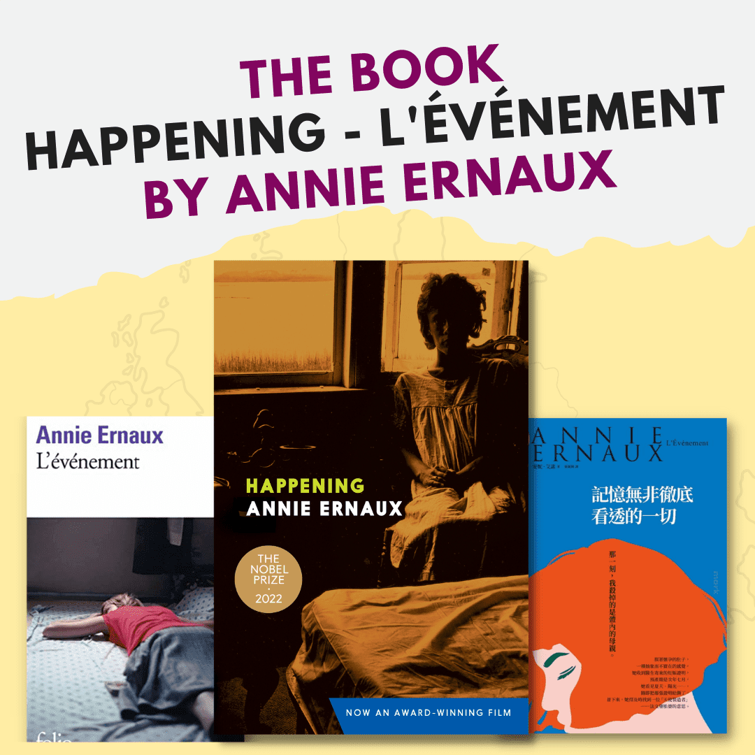 The event will be the third chapter of the EU Book Club, a collaboration between Italy, Germany and France, combining literature and film. After the first two talks and screenings organised by our Italian and German counterpart - "Clash of Civilizations over an Elevator in Piazza Vitorio" by Amara Lakhous and "The Collini Case" by Ferdinand von Schirach respectively, AFHK is happy to present "Happening (L'Evénement)" by the lastest laureat of the Nobel Prize in Literature, Annie Ernaux.