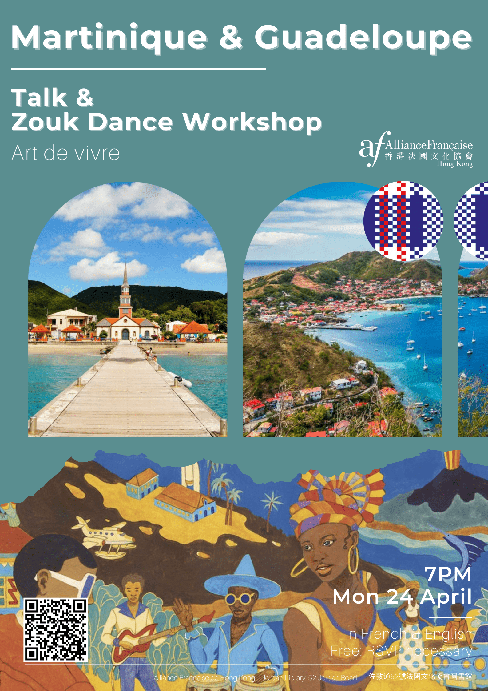 Venez plonger dans les eaux de la Caraïbe à travers l'histoire, la culture, l'économie, la danse, la musique, les coutumes des deux îles sœurs situées à 15 600 km de Hong Kong si éloignées et pourtant si proches. Si vous souhaitez découvrir la culture exotique exceptionnelle de la Martinique et de la Guadeloupe, vous êtes accueillés à participer à la conférence et à l'atelier de découverte du Zouk : danse traditionnelle de Martinique et des îles de la Guadeloupe.